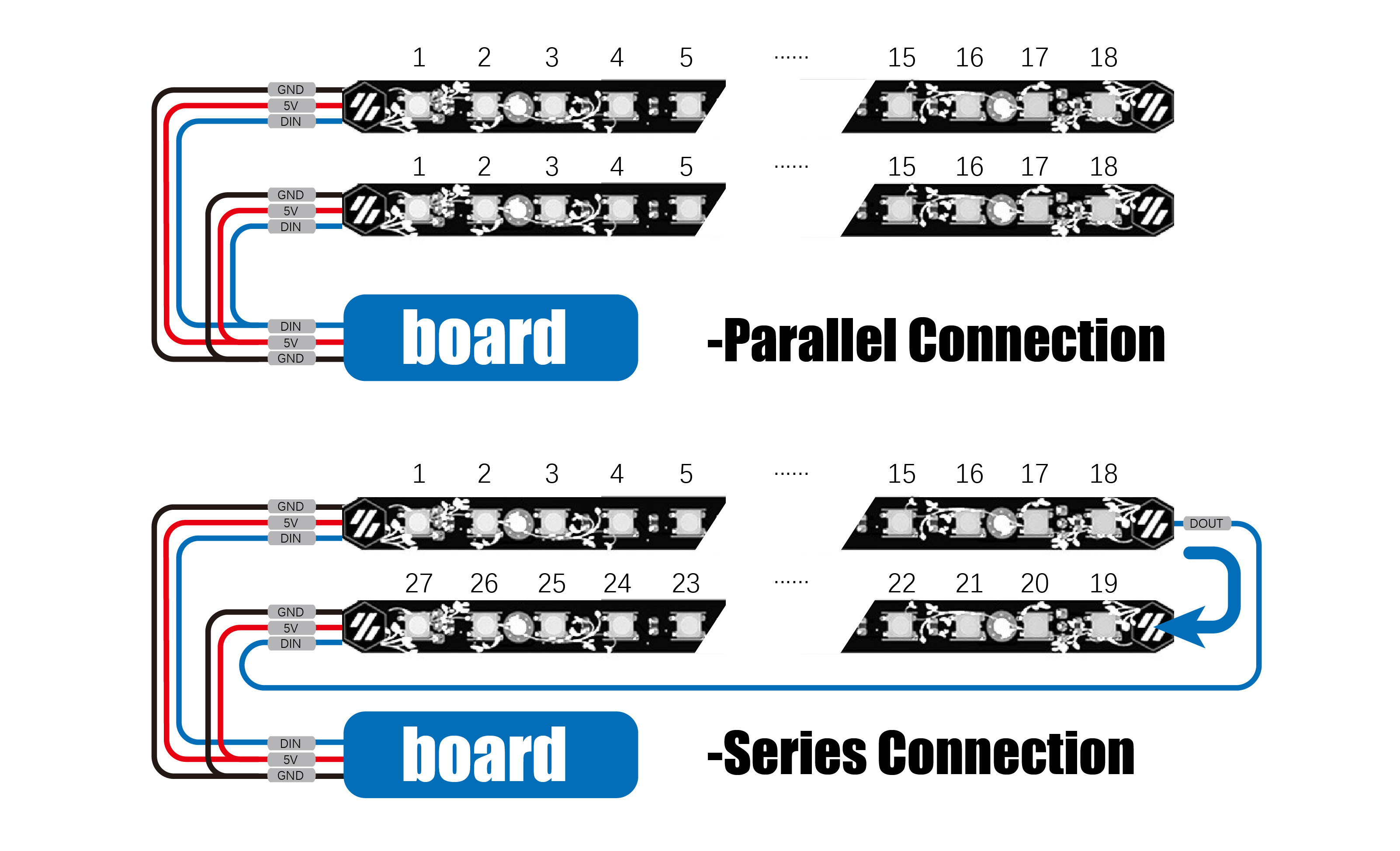 In a series connection, each LED can be precisely controlled, allowing for unique effects to be defined for each light.