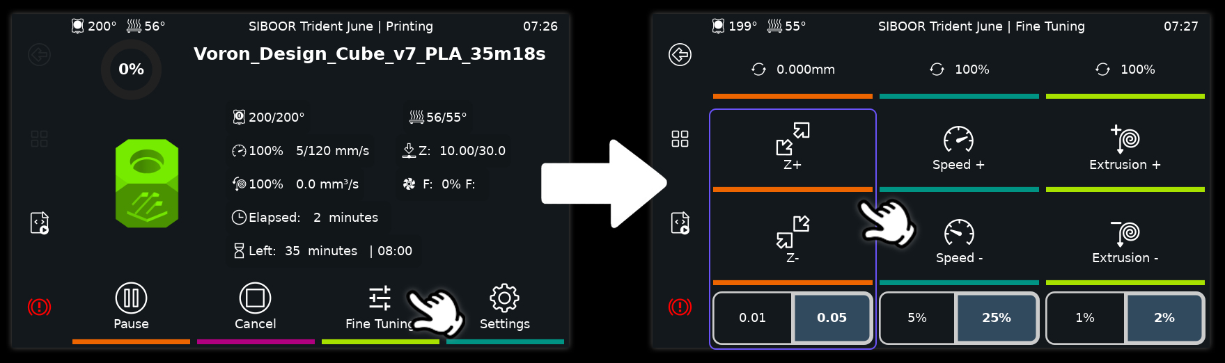 Refer to the image below to determine whether the nozzle is too close to or too far from the platform. Adjust the Z-offset using the display screen or the web interface. Once you have made the necessary adjustments, you can click "Save Configuration" after the print is complete. This will ensure that the settings are retained and applied for future prints.