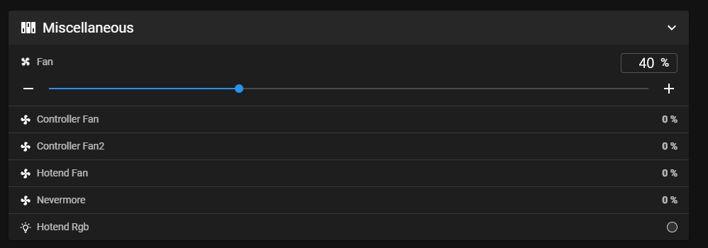 The Part cooling Blower can be directly controlled in Miscellaneous for on/off and speed settings.&#x20;