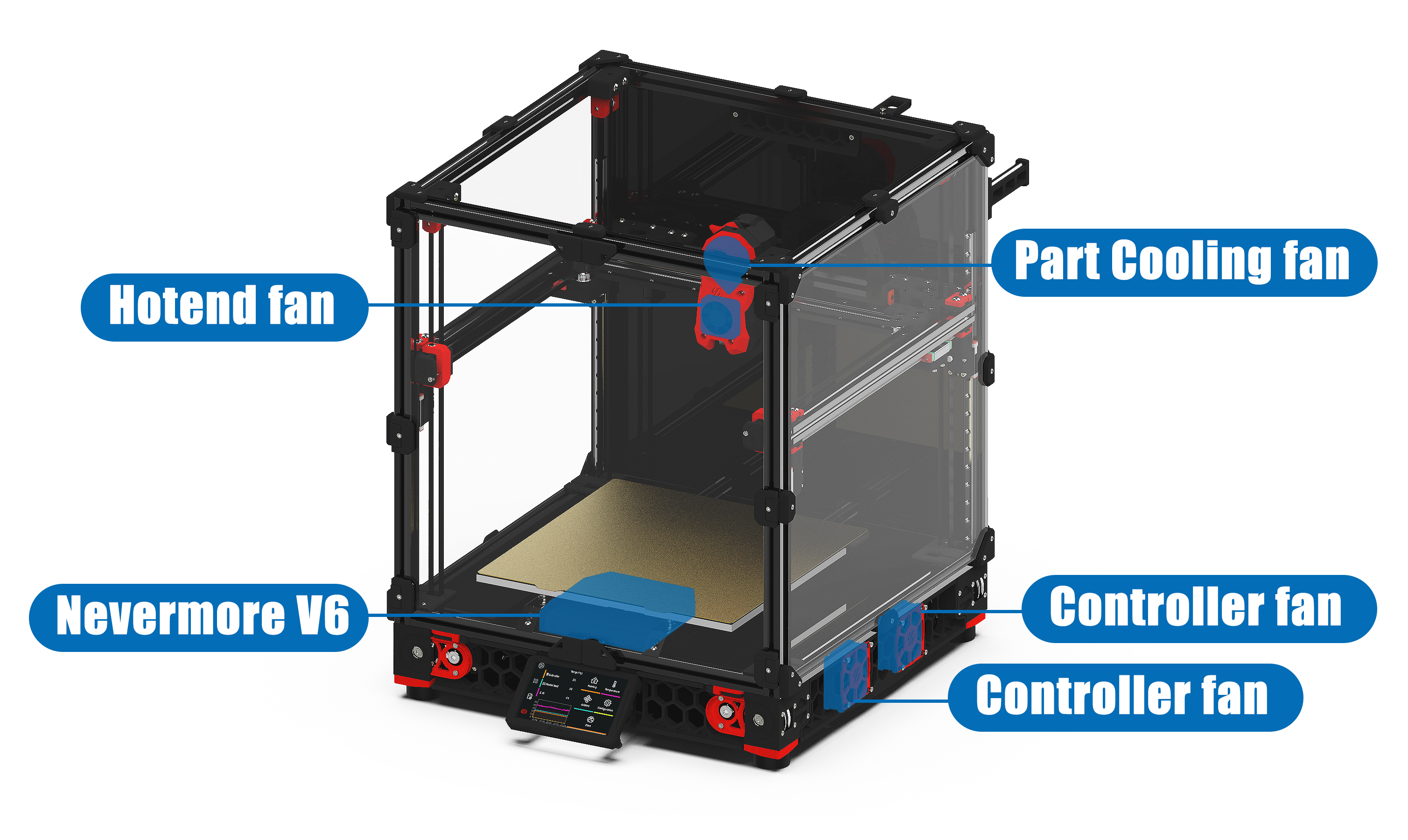 <table><thead><tr><th width="170">Name</th><th width="176">Specifications</th><th width="111">PIN</th><th>Startup method</th></tr></thead><tbody><tr><td>Hotend_fan</td><td>4010 FAN</td><td>EbbCan：gpio14</td><td>Hotend＞50℃</td></tr><tr><td>Part cooling fan</td><td>5015 Blower fan</td><td>EbbCan：gpio13</td><td>Manually or in slicing software</td></tr><tr><td>Controller_fan1</td><td>6020 FAN </td><td>PE5</td><td>Heatbed＞50℃</td></tr><tr><td>Controller_fan2</td><td>6020 FAN </td><td>PD12</td><td>Heatbed＞50℃</td></tr><tr><td>Nevermore V5</td><td>5015 Blower fan ×2</td><td>PA8</td><td>Horend＞200℃</td></tr></tbody></table>