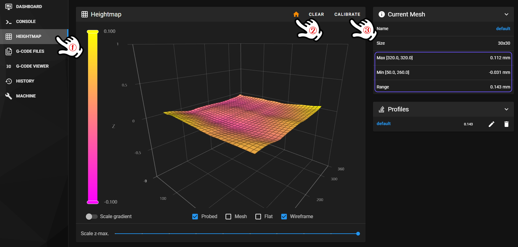 On the HEIGHTMAP interface, first home all axes, then click **CALIBRATE**.\