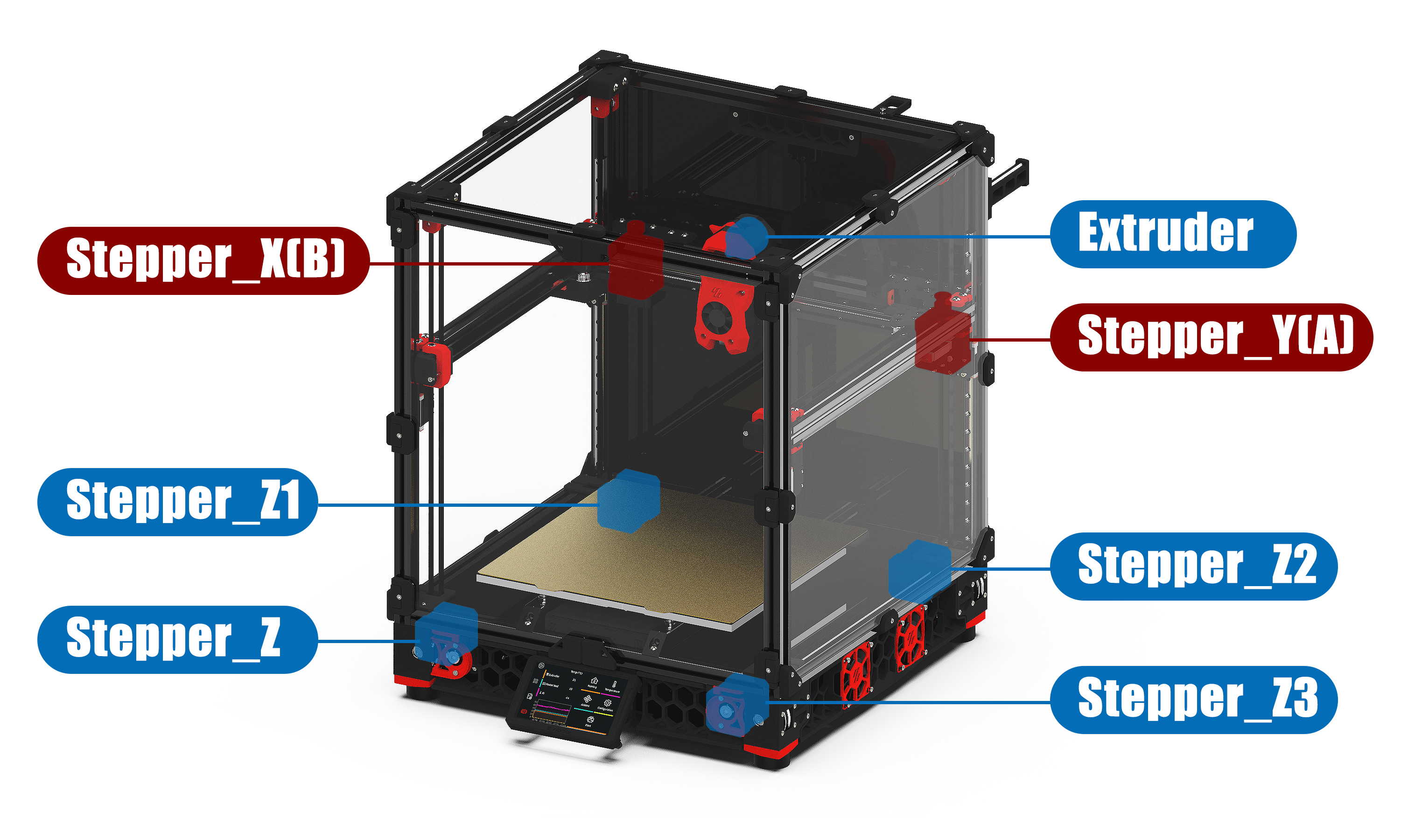 <table><thead><tr><th width="165"></th><th></th></tr></thead><tbody><tr><td>stepper_x</td><td>The motor will rotate clockwise first, then back counterclockwise</td></tr><tr><td>stepper_y</td><td>The motor will rotate clockwise first, then back counterclockwise</td></tr><tr><td>stepper_z</td><td>The front left corner of the gantry moves up, then back down</td></tr><tr><td>stepper_z1</td><td>The front left corner of the gantry moves up, then back down</td></tr><tr><td>stepper_z2</td><td>The front left corner of the gantry moves up, then back down</td></tr><tr><td>stepper_z3</td><td>The front left corner of the gantry moves up, then back down</td></tr><tr><td>extruder</td><td>Movement: Direction will be tested later.</td></tr></tbody></table>