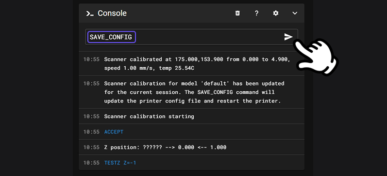 Run a `G28` command to home the printer since a `SAVE_CONFIG` restarts the printer.