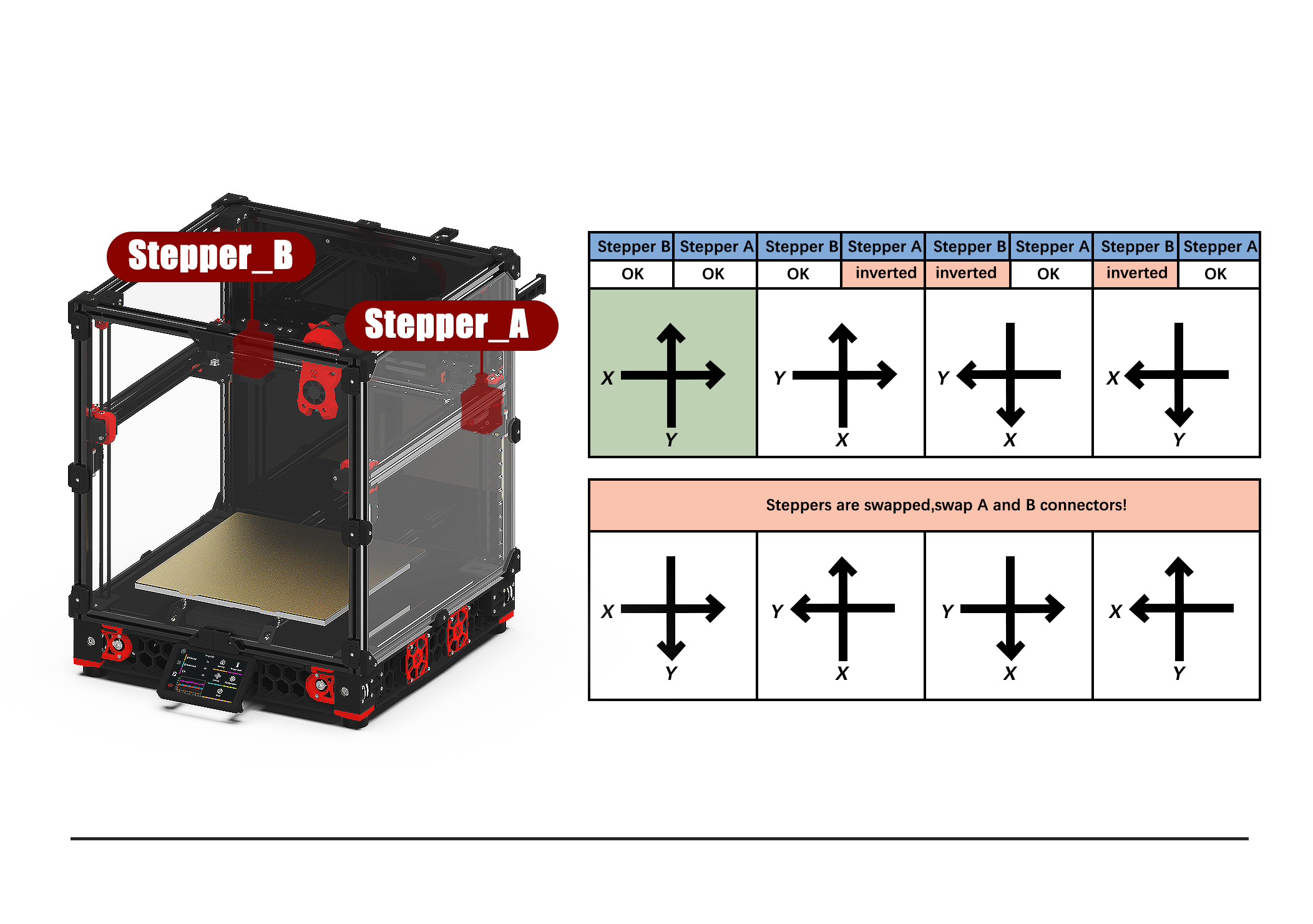 If either axis does not move the toolhead in the expected or correct direction, refer to the table below to figure out how to correct it. If you need to invert the direction of one of the motors, invert the direction pin definition by adding a `!` to the pin name. For example, `dir_pin: PB2` would become `dir_pin: !PB2`. (if the entry already has a `!`, remove it instead). If the motors are going in directions that match the lower row of the chart, physically swap your X and Y (A and B) motor connectors on the MCU.
