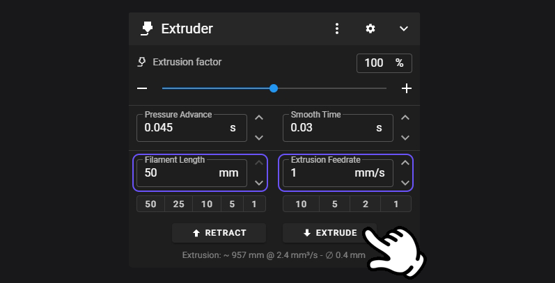 * In Mainsail, set the extrusion speed to 1mm/s, and extrude 50mm 2 times, (for a total of 100mm since Klipper doesn’t allow you to extrude more than 50mm at a time).