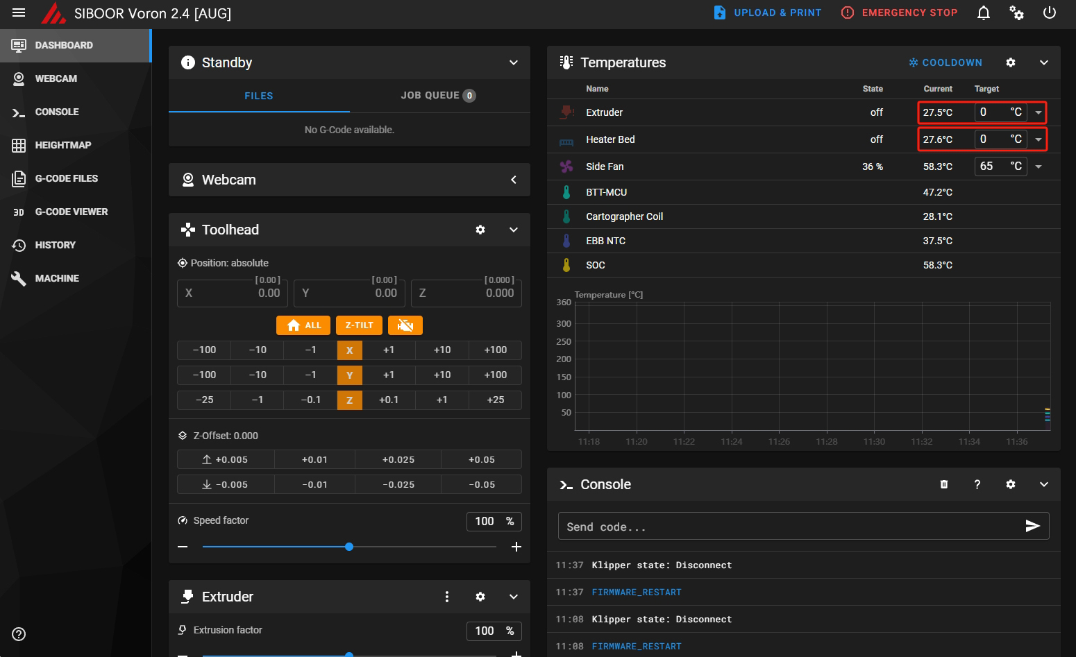 Start by verifying that temperatures are being properly reported. Navigate to the Mainsail temperature graph.