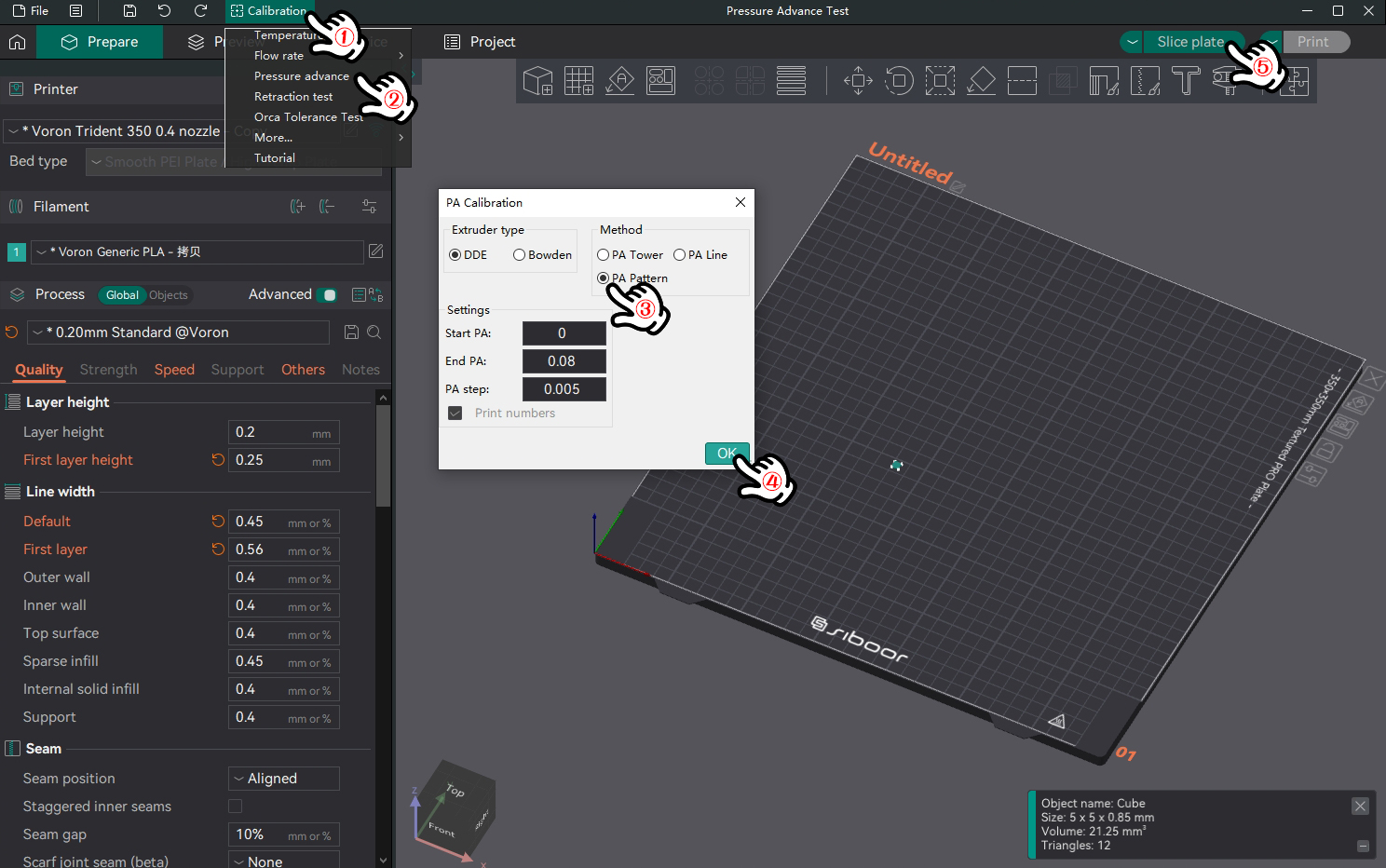 * You can test the adjusted pressure\_advance value by printing a VORON cube to check the sharpness and consistency of the corners.